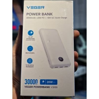 Портативний зарядний пристрій Павербанк VEGER — 30000 mAh + PD 20 W + LED Display Screen + 3.0 Quick Charge — підходить для заряджання будь-яких пристроїв, як на операційній системі IOS і Андроїд, так і для інших пристроїв із USB-входом. Може заряджати одночасно три пристрої. Має ліхтарик і екран для зображення залишкового заряду.